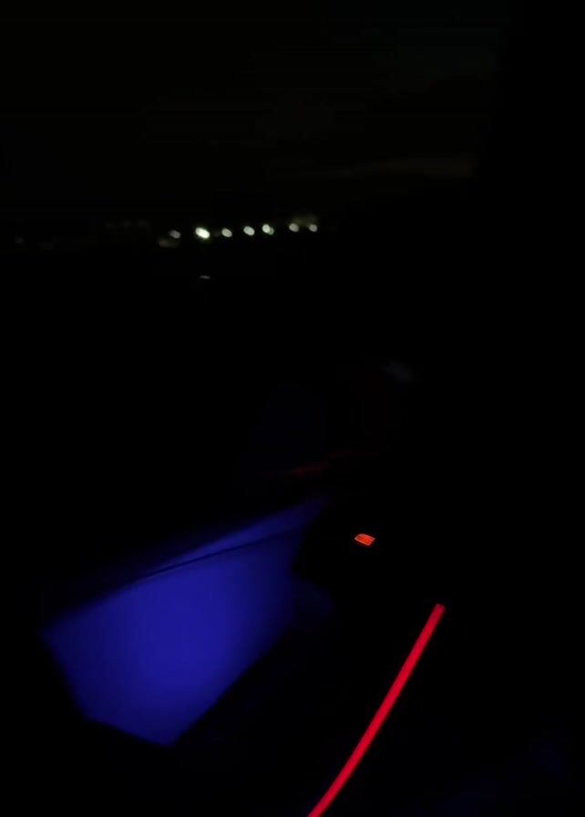 interior of a car at night. There are blue lights illuminating the floor of the car and a red light strip along the dashboard. Through the windshield, blurry lights can be seen in the distance. The camera pans around the dashboard, showing a few small orange and green lights.