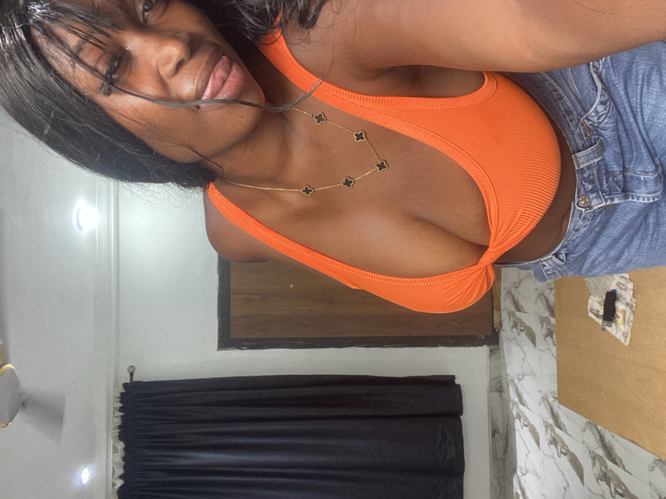 An adult female subject is prominently featured in a close-up indoor photograph taken in Joma, Ghana. The subject, exhibiting a dark complexion and long dark hair, is positioned facing the camera, with her tongue partially extended from the right side of her mouth. She is attired in a bright orange, ribbed crop top with a twisted detail at the front, revealing significant cleavage, and blue denim jeans that appear partially unzipped. A gold-colored necklace, featuring five black four-leaf clover-shaped pendants, is worn around her neck. The background details an interior space. A white ceiling with a white and gold ceiling fan is visible above. Two light fixtures are embedded in the ceiling. To the left, a black curtain hangs from a dark rod against a light-colored wall. Directly behind the subject, a dark brown wooden door with a light-colored frame is present. The floor consists of white and grey marble-patterned tiles. In the lower foreground, a light brown wooden surface, consistent with a table, holds a small black cylindrical object (possibly a lighter) resting on folded white material.
