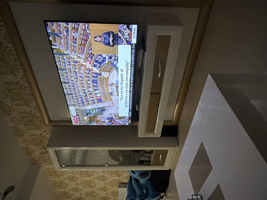 This image depicts a dimly lit residential interior located in Torrejón de Ardoz, Spain. The central focus is a large flat-screen television displaying a live news broadcast from RTVE 24h, indicated by the channel logo and a visible timestamp of 13:56:41. The screen's main segment shows an overhead view of a legislative plenary session ("Pleno del Congreso") with numerous individuals seated within a chamber. A prominent text overlay presents the quote: "\"Vox no ha llegado al gobierno y ya está corrompido\"" (Vox has not reached the government and is already corrupt). A smaller inset window on the lower right of the television shows a woman with dark hair, dressed in a dark top, performing sign language. The television is situated on a modern white and light wood-toned entertainment unit featuring a floating shelf with two drawers, integrated into a larger wall-mounted frame with a gold or light wood inner border. To the left of this unit stands a tall, narrow white cabinet with a glass-front upper section containing indistinct items, and two lower drawers with light wood panels and silver-colored handles. Several dark diffuser sticks protrades from the top of this cabinet. In the foreground, a rectangular white coffee table with two light brown square inserts on its surface is partially visible. A small, dark object rests on the coffee table. The floor is a light, possibly tiled or laminated, surface. The walls are covered with a patterned wallpaper featuring a gold or light brown damask-like design. A partially visible blue fabric object, possibly part of seating, is present in the lower left background. No individuals are physically present within the immediate room.