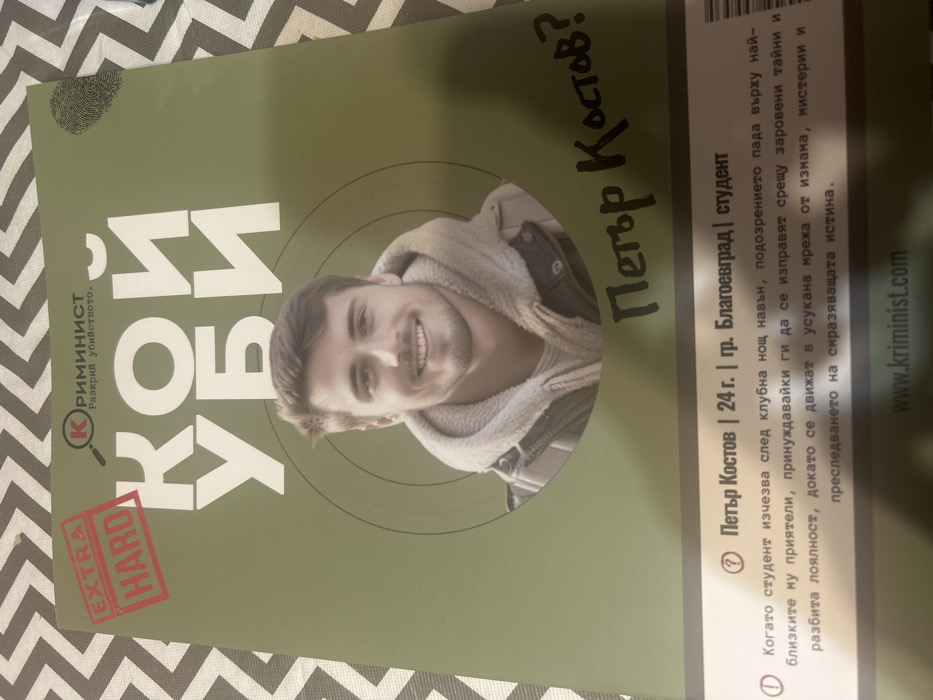 The image depicts a printed game box or booklet for a murder mystery game, presented on a light grey and white chevron-patterned surface. The item's primary color is olive green. Dominant white Cyrillic text across the upper half reads "КОЙ УБИ" (Who Killed), above which is a red "EXTRA HARD" stamp and a magnifying glass logo for "КРИМИНИСТ" (Kriminist). A faint fingerprint graphic is visible in the top right corner. The central feature is a circular photograph of a smiling young adult male with short brown hair and light stubble, wearing a grey hooded jacket over a dark outer layer. Below his image, in a handwritten-style font, is "Петър Костов?" (Petar Kostov?). A horizontal grey band at the bottom contains text identifying the individual: "Петър Костов | 24 г. | гр. Благоевград | студент" (Petar Kostov | 24 y.o. | city Blagoevgrad | student). Accompanying Bulgarian text describes a plot where the student disappears after a night out, leading to suspicion among his friends and a web of deceit. The website "www.kriminist.com" is visible at the very bottom. The environment is an indoor setting, illuminated by ambient light. The individual "Петър Костов" is identified as being from Blagoevgrad, Bulgaria; no information regarding Vratsa, Bulgaria, is present in the image.