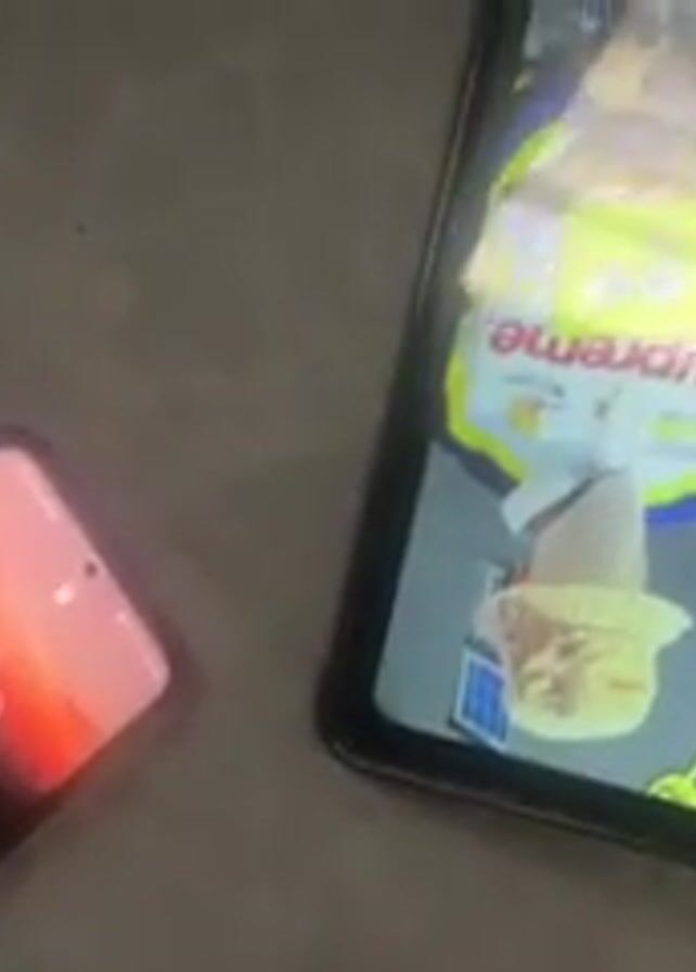 Two smartphones are positioned on a flat gray surface. The phone on the left displays a dark screen with the time "2:03" and a shadowy image. The phone on the right displays a video of an individual wearing a SpongeBob SquarePants-themed Supreme outfit. The video is upside down. Surrounding the individual are various SpongeBob characters, including Mr. Krabs.