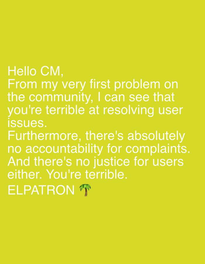 This digital image presents white sans-serif text centered on a solid, vibrant yellow background. The text reads: "Hello CM, From my very first problem on the community, I can see that you're terrible at resolving user issues. Furthermore, there's absolutely no accountability for complaints. And there's no justice for users either. You're terrible." The message concludes with "ELPATRON" followed by a palm tree emoji (🌴). The image depicts a complaint message. No individuals or physical objects other than the text are visually represented. This scene is located in the city of Meknes, Morocco.