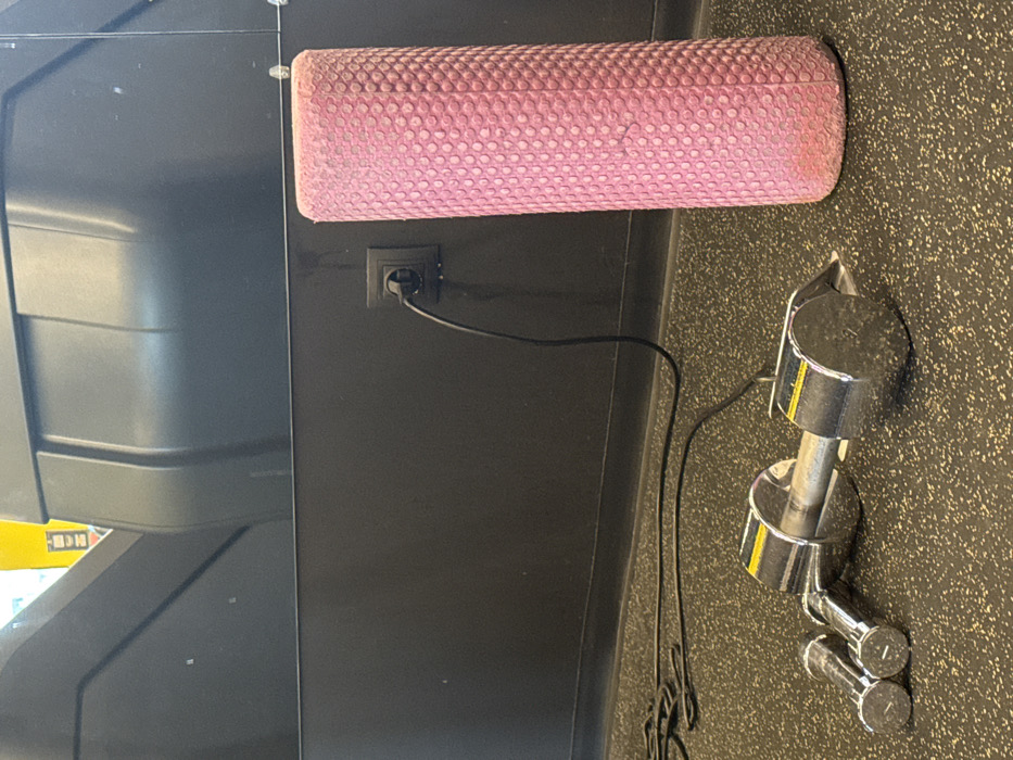 This image captures an interior view of a gym facility in Sofia, Bulgaria. The floor is covered with a dark, speckled rubberized mat. Against a matte dark gray wall, a black European-style electrical outlet (Type F/CEE 7/7) is visible, with a black power cord plugged in and extending onto the floor. On the left side of the floor, three small, chrome-plated dumbbells are grouped together, adjacent to a larger, chrome-plated adjustable dumbbell or barbell handle with circular end weights. To the right, a cylindrical pink foam roller, textured with raised circular bumps, stands vertically on the floor. The upper half of the scene shows a reflective surface, likely a mirror, behind which dark, geometric shapes of gym equipment are reflected, with a partial yellow object visible in the upper background. No individuals are present.
