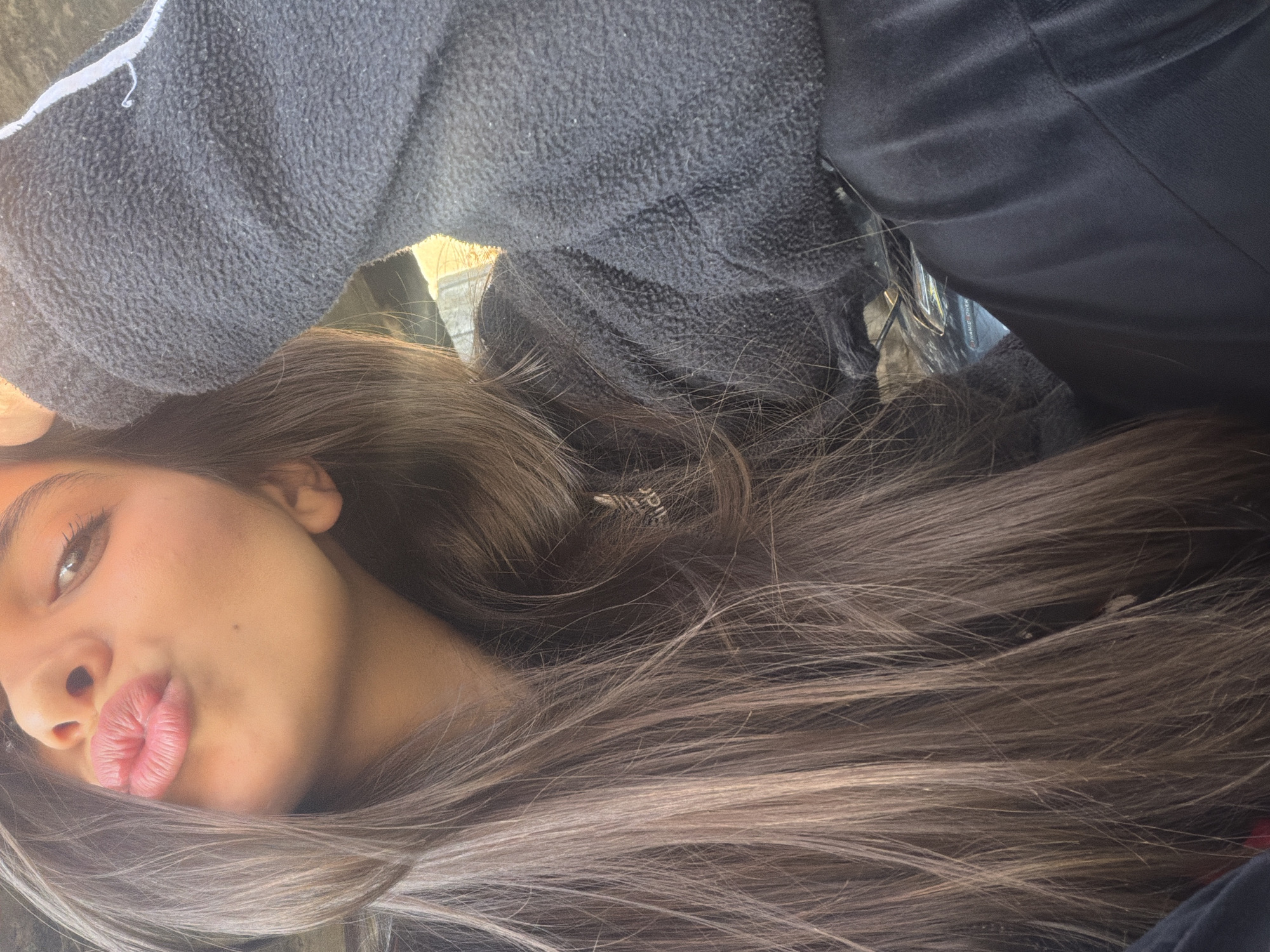 A close-up, slightly angled, and rotated portrait of a young woman with long brown hair. Her face is visible from the nose to the top of her forehead. She is making a kissing face. A dark gray fuzzy material is visible behind her head and to the upper left of the frame. A darker, smoother material appears behind her hair and to the upper right. The background is generally out of focus. There are no indications about the location of Rudartsi, Bulgaria.