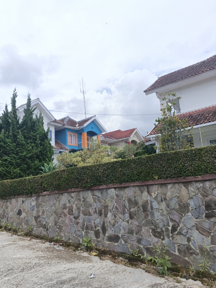 This image depicts a residential scene in Unknown, Vietnam, under an overcast sky. In the foreground, a concrete surface occupies the bottom portion, leading to a retaining wall constructed from irregularly shaped, multi-toned stone masonry. Small weeds and vegetation grow along the base of this wall. Above the stone wall, a dense, dark green trimmed hedge forms a boundary. Behind the hedge, a variety of trees and shrubs are visible, including tall, dark green conifers on the left and lighter green foliage towards the right. The background features multiple houses with reddish-brown tiled roofs. A prominent house in the center-left displays a bright blue facade with orange window trim. An antenna structure is mounted on its roof. Adjacent houses exhibit white or light-colored exteriors with similar tiled roofs. A single black electrical wire spans horizontally across the upper midground. The sky is predominantly cloudy with varying shades of white and grey. A faint, dark, unidentifiable object is visible high in the sky. No individuals are present in the scene.