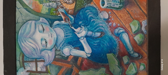 This is a vertical, full-color artwork, appearing as a drawing or painting, depicting a humanoid figure. The figure possesses light blue skin, pale blue hair, and rosy cheek accents, and is attired in a dark blue dress with ruffled white trim on the short sleeves and neckline. Visible joints are present on the limbs. The figure is seated on a brown wooden surface, looking downwards with closed eyes. It holds a brown-handled carving tool in its right hand and a small, white, cylindrical object in its left hand, actively engaged in carving. Scattered on the wooden surface around the figure are numerous small white fragments, presumably from the carving process. A detached, jointed light blue leg matching the figure's appearance lies horizontally on the wooden surface to its left. Several irregular, large green fragments are also present on the surface. To the right of the figure, a light blue vessel containing small fragments is visible. The background on the left features a broken brown window frame with green abstract forms beyond it. On the right, an arched opening reveals an outdoor scene with a light-colored path, white structures, green foliage, and an orange-pink horizon. This artwork is located in the city of Tinaquillo, Venezuela.