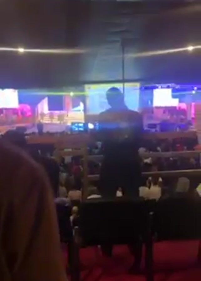 concert or party setting, with a stage visible in the background, lit with various colors. People are standing around, some wearing white shirts, and appear to be dancing or enjoying the music. The lighting changes throughout the video, shifting between blue, green, and pink. There is a mix of individuals in the crowd, including some wearing hats or casual clothing.