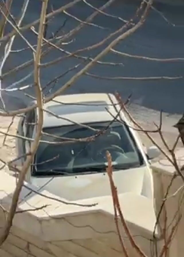 view from above of a white car parked on a road with a person visible inside. The scene includes a tan-colored wall or balcony in the foreground with some bare trees obscuring parts of the view. In the background, there's a road winding through a hilly landscape, with buildings visible on the slopes. The sky is bright, suggesting it's daytime. The camera pans slightly to reveal more of the environment.