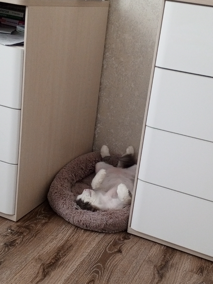 An indoor scene in Berezovka 1, Russia, depicts a domestic cat sleeping on its back in a circular, plush, light brown pet bed. The cat, exhibiting white fur with gray markings on its head, back, and tail, is positioned between two pieces of furniture in a corner. To the left, a light wood-toned cabinet features white drawer fronts on its lower section, with papers visible on its upper surface. To the right, a white multi-drawer cabinet with a light wood trim is partially visible. The wall behind the cat bed and furniture is light-colored and textured. The flooring consists of brown-toned wood laminate.