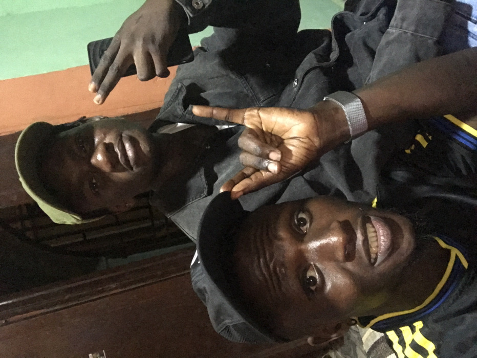 The image displays two adult males with dark complexions, positioned indoors. The individual in the foreground, occupying the left side, wears a black baseball cap, a black shirt with yellow horizontal stripes on the shoulders, and a silver-toned mesh wristband on his left wrist. He looks directly at the camera with a slightly open-mouthed expression and raises his right hand, extending his index and pinky fingers while his thumb secures the middle and ring fingers. The individual in the background, positioned to the right and slightly behind, wears a light olive-green baseball cap and a dark-colored denim-style jacket over a visible white undershirt. He holds a dark-colored smartphone vertically in his right hand, with his index and middle fingers extended in a V-shape. Both subjects face the camera. The background environment consists of a dark wooden panel or door on the left and a two-toned wall on the right, painted light orange in the lower section and light green in the upper section. The scene is illuminated by artificial light. This event occurred in Lagos, Nigeria.