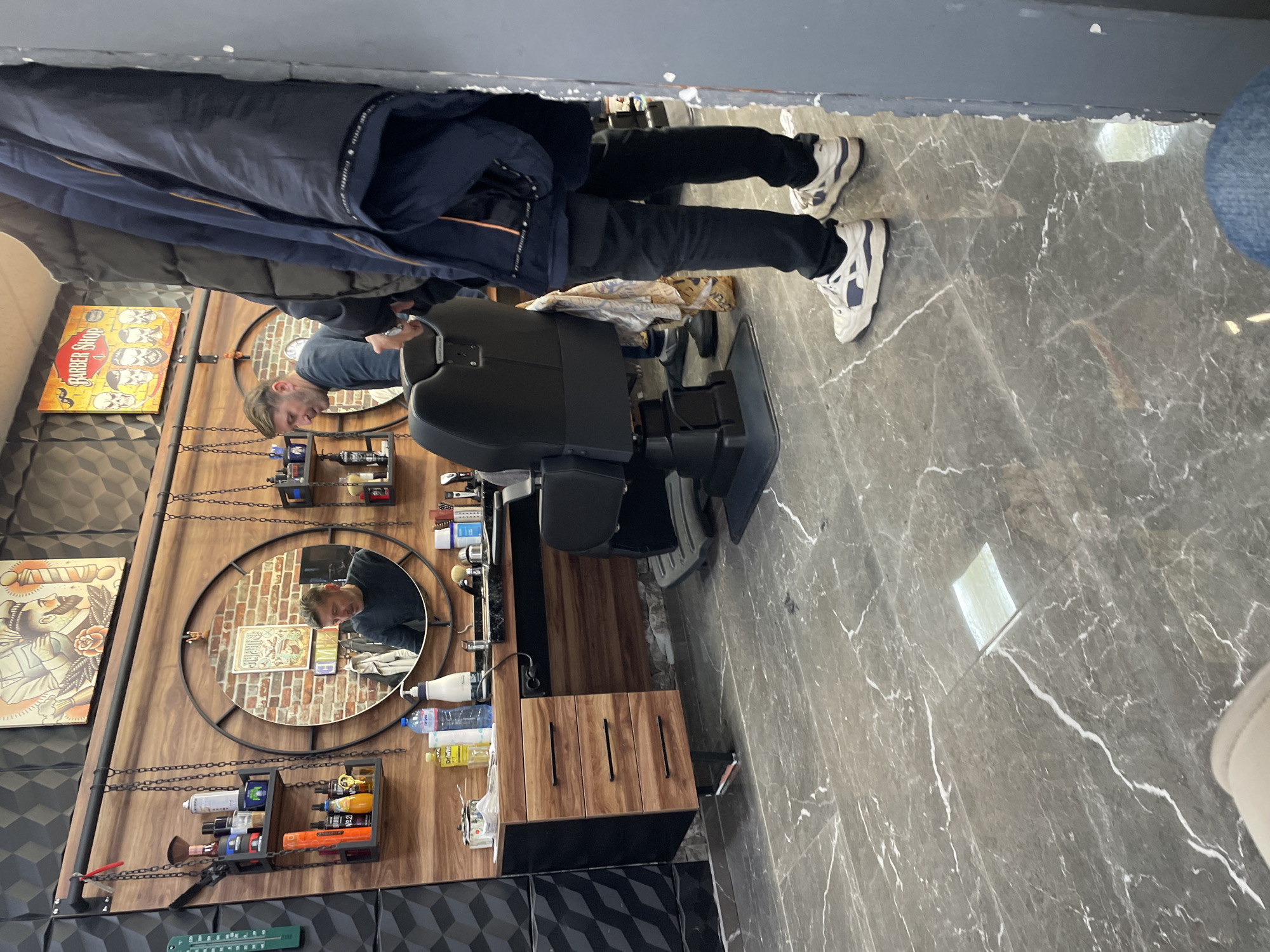 interior of a barbershop. A barber is attending to a customer in a black barber's chair. The customer is wearing black pants and white sneakers with blue accents. A jacket is hung up near the customer. The barbershop has a wood-paneled wall with two round mirrors, a shelf with various barbering supplies, and framed tattoo artwork. The floor is made of gray marble. A sign with a drawing of skulls that says "Barber Shop" is visible on the wall. The picture was taken in Stara Zagora, Bulgaria.