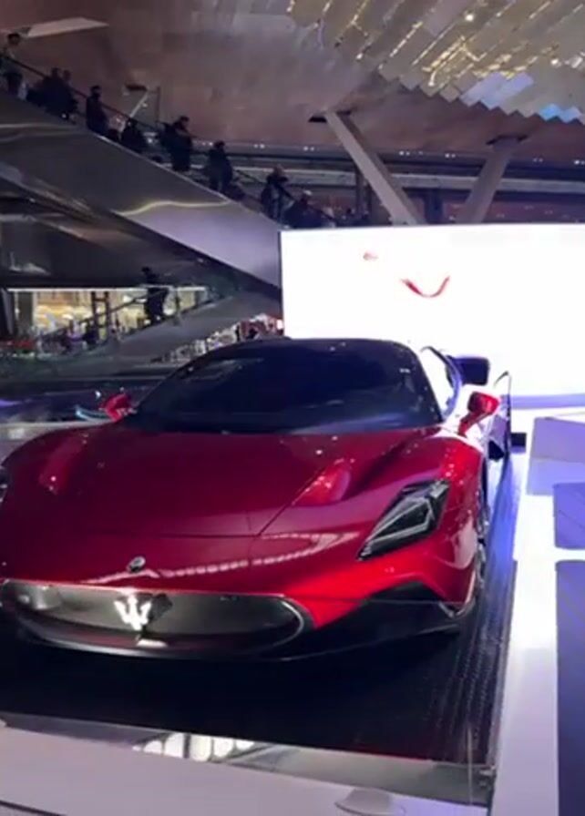 The video presents a red Maserati MC20 on display inside a building with an escalator filled with people