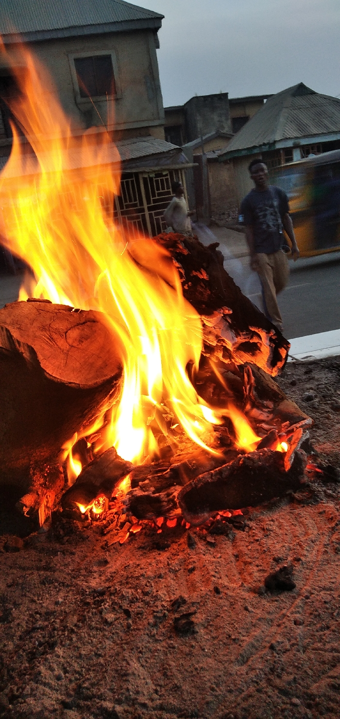 A large bonfire rages in the foreground, fueled by thick logs. Behind the fire, two individuals are visible, one dressed in white and another in a dark shirt and tan pants. They appear to be walking along a street, with buildings visible in the background. The sky is overcast, suggesting either early morning or late evening.