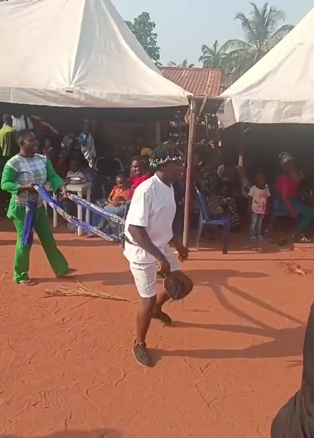 traditional dance taking place outdoors on a red dirt ground, likely at a celebration or event