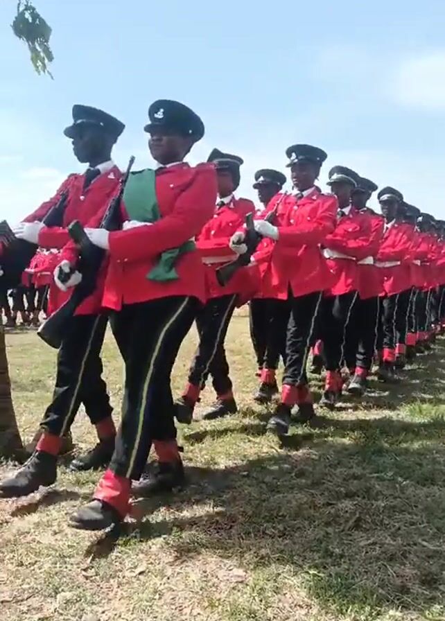 A long row of people in red military-style uniforms and black caps stand in a line on a grassy field