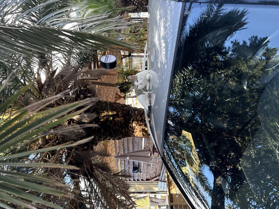 The image captures an outdoor scene in Budva, Montenegro, positioned near the "Marvel Restaurant & Bar," as indicated by a prominent circular sign displaying its name. A domestic cat, predominantly white with tabby (brown/grey striped) markings on its back, head, and tail, is resting horizontally on the silver-colored roof of a passenger vehicle, likely an SUV or hatchback, with its front paws tucked and its gaze directed towards the viewer. The car's windshield distinctly reflects dense green palm tree fronds and a bright blue sky. Numerous large palm trees with thick, textured trunks and a mix of green and dried fronds are visible, casting shadows across the sunlit environment. In the background, a light brown wooden structure with horizontal slats, consistent with an outdoor restaurant or bar, is present. A partially visible, dark brown umbrella is open to the left of the cat. A human figure, wearing a yellow shirt, is partially visible on the far left, standing upright near a wooden counter or table. The scene is illuminated by bright daylight.
