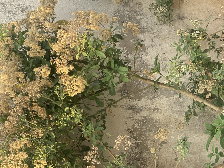 - "Plants with green leaves and clusters of small, cream-colored, fuzzy flowers grow against a textured gray wall" by FM-UieN92, licensed under CC BY 4.0