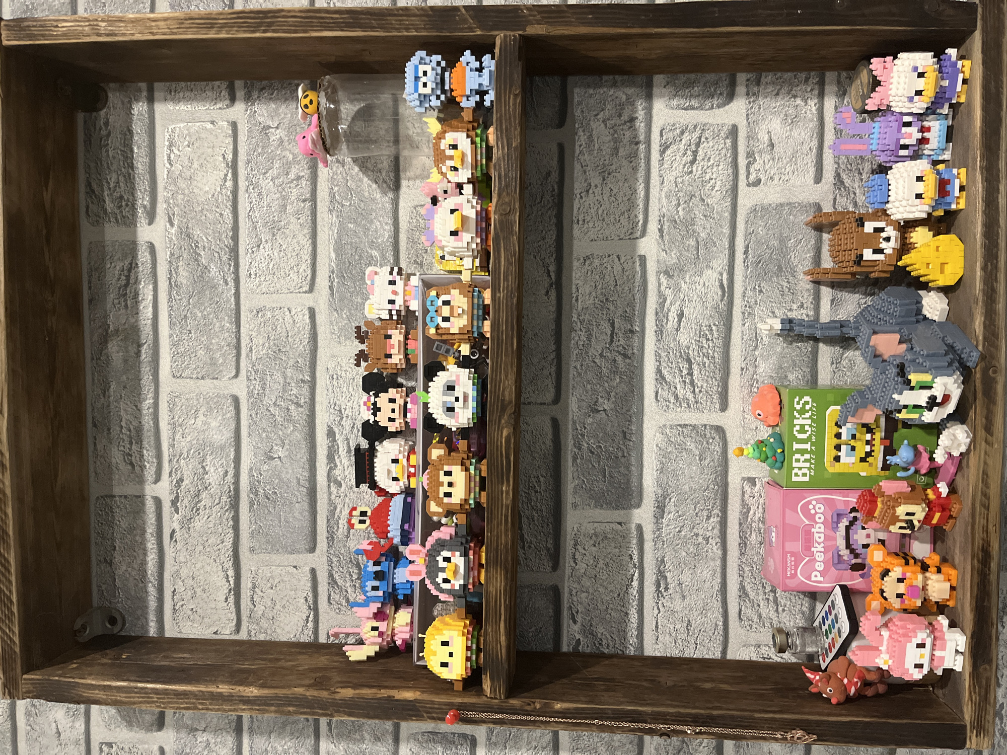 A two-tiered wooden shelf is mounted on a light gray brick wall. The shelf is filled with miniature pixel-style block figures resembling cartoon characters and animals. The left side of the shelf contains a row of these figures stacked vertically, while the right side has a similar arrangement along with a few small boxes and additional objects. A clear glass bottle is placed near the top of the left stack, and a remote control, small bottle, and a necklace with a heart-shaped charm are at the bottom of the right stack. The scene is well-lit and indoors. Vesyoloye, Russia, is not depicted in the image, nor is there a suggestion about its location. There are no people in the picture, only objects.