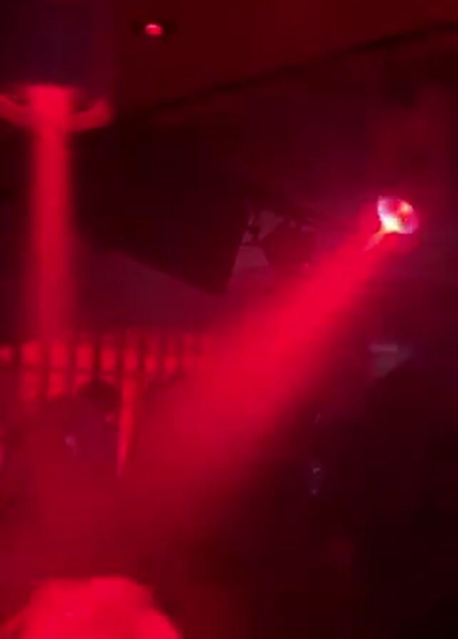 The video captures a vibrant nightlife scene in what appears to be a nightclub or lounge. A crowd of people is visible, mainly in silhouette due to the low and heavily-colored red lighting. A DJ booth is suggested, and the music is audible in the background. Above the crowd, several large speakers and lighting rigs are suspended from the ceiling, adding to the intense atmosphere. The room seems packed, and people are likely dancing or enjoying the music. Overall, the video depicts an exciting and energetic nightlife environment.
