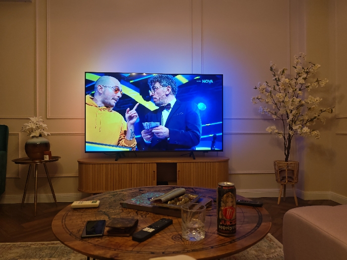 The image depicts the interior of a living room in Unknown, Unknown. The walls are light-colored with decorative wainscoting. A large flat-screen television is centered on a light wood credenza, displaying a program from the "NOVA" channel. On screen, a bald man with a beard, wearing a yellow hooded sweatshirt and orange sunglasses, gestures with his right hand towards a man with curly hair and glasses, dressed in a dark suit and bow tie, who holds a stack of cards or similar items. In the foreground, a round wooden coffee table with a map design sits on a light-colored patterned rug. On the coffee table are a dark smartphone, a dark brown rectangular object resembling a wallet, three black remote controls, an empty textured glass, a black "JUICE MONSTER" energy drink can, and a dark tray containing several metallic cylindrical objects. To the left of the television, a small metallic side table holds a brown and green vase with artificial white lily-like flowers and a small dark cylindrical object. A section of a teal green upholstered armchair is partially visible on the far left. To the right of the television, a tall artificial tree with white blossoms stands in a wicker basket on a wooden stand. A section of a light pink upholstered furniture piece is visible on the far right. No persons are present within the room itself.