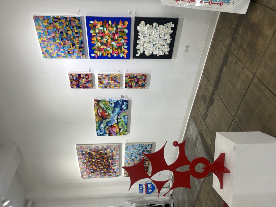 A modern art gallery displays abstract paintings on a white wall. The paintings vary in size and color, featuring textured brushstrokes and vivid hues. Below the paintings, a red metal sculpture with geometric shapes sits on the floor near a white cube. The gallery has a tiled floor. A "Breathe Now" sign is visible.