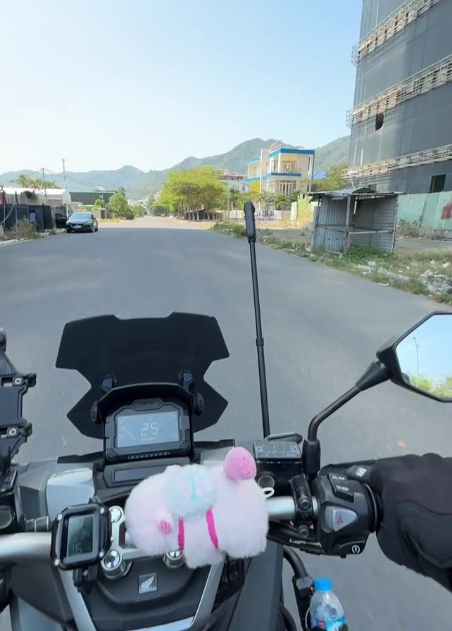 first-person perspective from a moving motorcycle on a paved road. The motorcycle has a digital speedometer displaying 24 kph. There is a pink and white bunny plushie attached to the handlebars. The rider is wearing a black glove on their right hand. A water bottle is visible in a holder on the right side. The road is lined with buildings, some under construction. As the motorcycle continues, the camera angle tilts upwards to show a cluster of tall, modern skyscrapers under construction against a clear blue sky with mountains in the background.