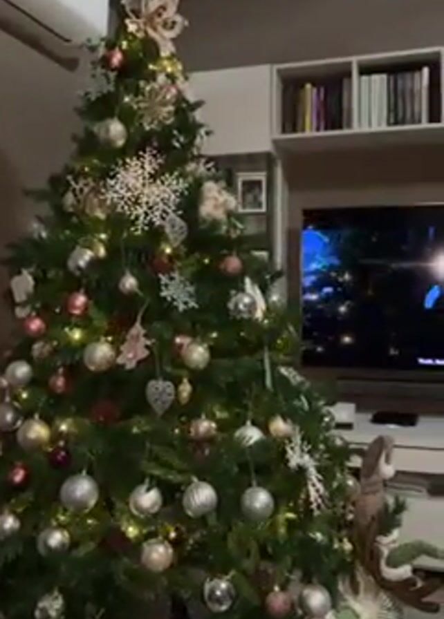 A decorated Christmas tree stands in a living room, with a television in the background showing a scene from the movie Avatar. The tree is adorned with silver, gold, and pink ornaments, snowflakes, and a star-shaped topper. The room features a bookcase filled with books and a decorative reindeer figurine. The television is displaying a scene with an underwater environment and characters from the film. The overall atmosphere suggests a cozy and festive holiday setting.