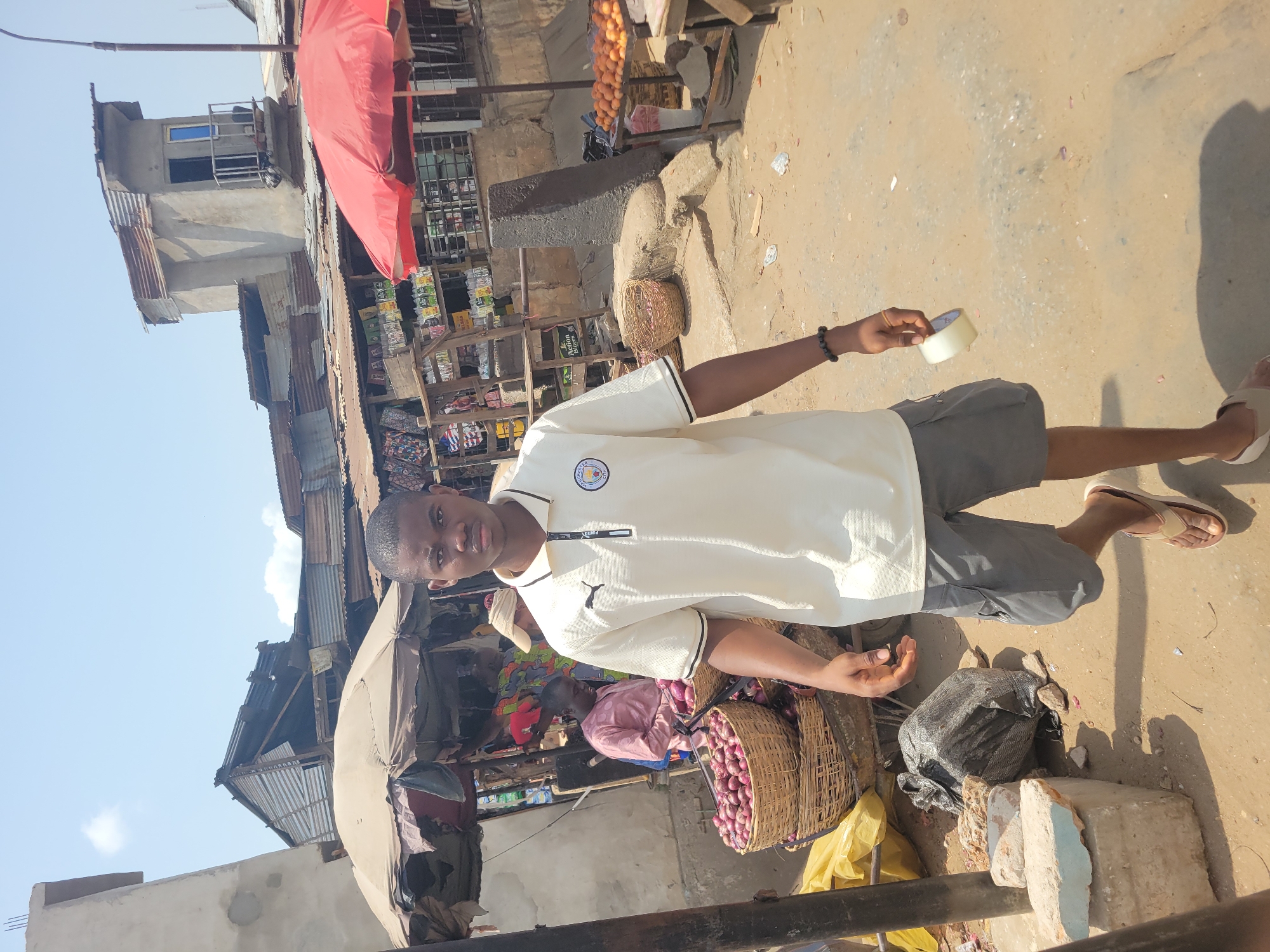 A young male stands centrally on a dirt and sand ground in a market street in Onitsha, Nigeria, facing the viewer under a clear, sunny sky. He is dressed in a cream-colored polo shirt with a black Puma logo and a circular badge on the chest, dark grey cargo shorts, and light-colored flip-flops. His right hand holds a roll of light-colored tape. To his immediate left, a market stall operates under a large, light-brown canvas umbrella. Seated behind multiple stacked woven baskets overflowing with red onions is a person in a light pink garment. Another individual, partially visible, stands behind them. Further left, an unpainted concrete building structure is partially visible. To the right of the central figure, a wooden table displays numerous brown eggs under a red umbrella. Behind this, shelves are stocked with various packaged goods, indicative of a general store or stall. The ground in the midground is uneven, littered with small stones and light debris. A dark, possibly concrete, post stands near the egg display. In the background, a series of low-rise buildings with corrugated metal roofs are visible. One prominent structure is a multi-story concrete building featuring an elevated balcony with a metal railing and a blue-tinted window/door. A utility pole extends upwards on the far right. The overall scene depicts a busy, informal urban market environment.