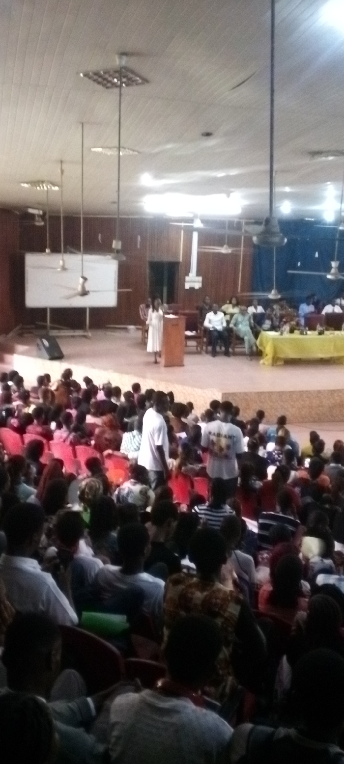 large group of people seated in a lecture hall, likely during a presentation or conference. A woman in a white dress stands in front of a podium addressing the audience. The room has a tiled ceiling and a white board on the wall. The audience is seated in rows on red chairs. There are also several people seated in the front row on brown chairs. The event appears to be taking place at the University of Lagos, Lagos, Nigeria.