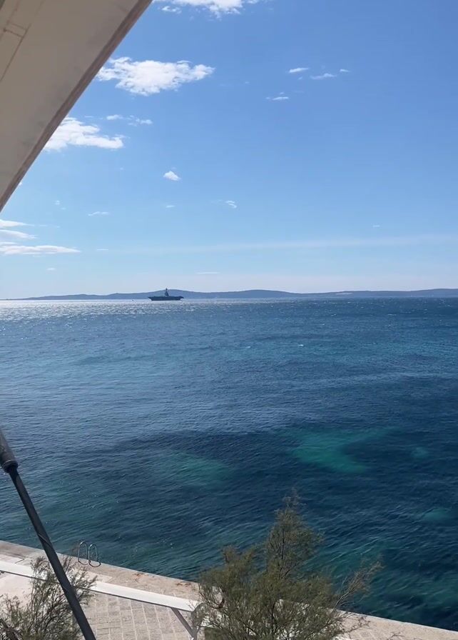 From an elevated position near a coastal area, a panoramic view of a serene blue sea under a bright, sunny sky is captured. A distant landmass and a single ship are visible on the horizon. The camera pans right to reveal a stone walkway lined with trees, and a clear view of the adjacent beach, showcasing the town's buildings and coastline. Two individuals are seen on the walkway, capturing photos or taking in the views. The perspective from underneath a white awning contributes to the overall view of the area.