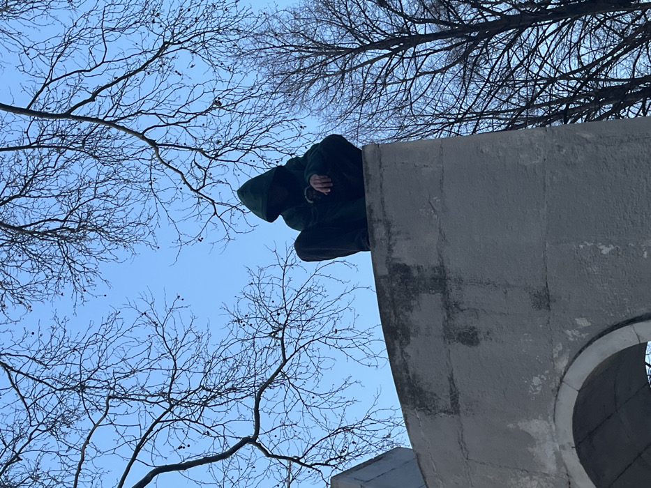 The image captures a solitary individual in a crouched position atop a weathered, light gray concrete structure in Pazardzhik, Bulgaria. The individual wears a dark green hooded garment, with the hood pulled up to completely obscure the face. A metallic object, possibly a bracelet or chain, is visible on the left wrist. The concrete structure exhibits a curved form and dark staining on its upper surface, with an archway visible on its lower-left side. The background consists of a clear, pale blue sky framed by numerous bare tree branches, indicative of a leafless season. Denser bare trees are visible towards the right side of the frame. The scene is static, with no other individuals or active elements present.