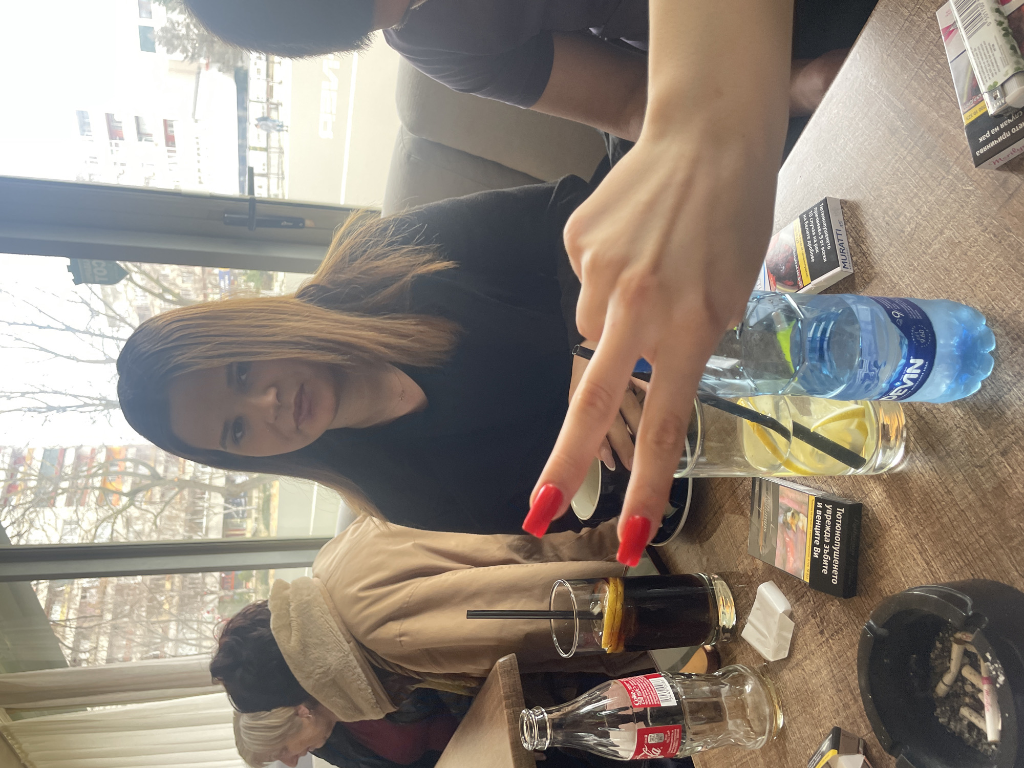 table scene inside what appears to be a cafe or restaurant. On the table, there are several items, including a water bottle labeled "DEVIN" with a price of 9.60, a glass of lemon water with a straw, a pack of "MURATTI" cigarettes with health warnings in Bulgarian, an ashtray filled with cigarette butts, an empty Coca-Cola bottle, and a glass of dark liquid with a straw. A woman with long brown hair and red nails is making a peace sign with her hand. There are other people present, including one with gray hair wearing a beige coat and another person partially visible at the top of the frame. Through the window, there is a view of buildings and trees. Given the Bulgarian language on the cigarette pack and the brand "DEVIN," it can be concluded that this is likely Kavarna, Bulgaria.