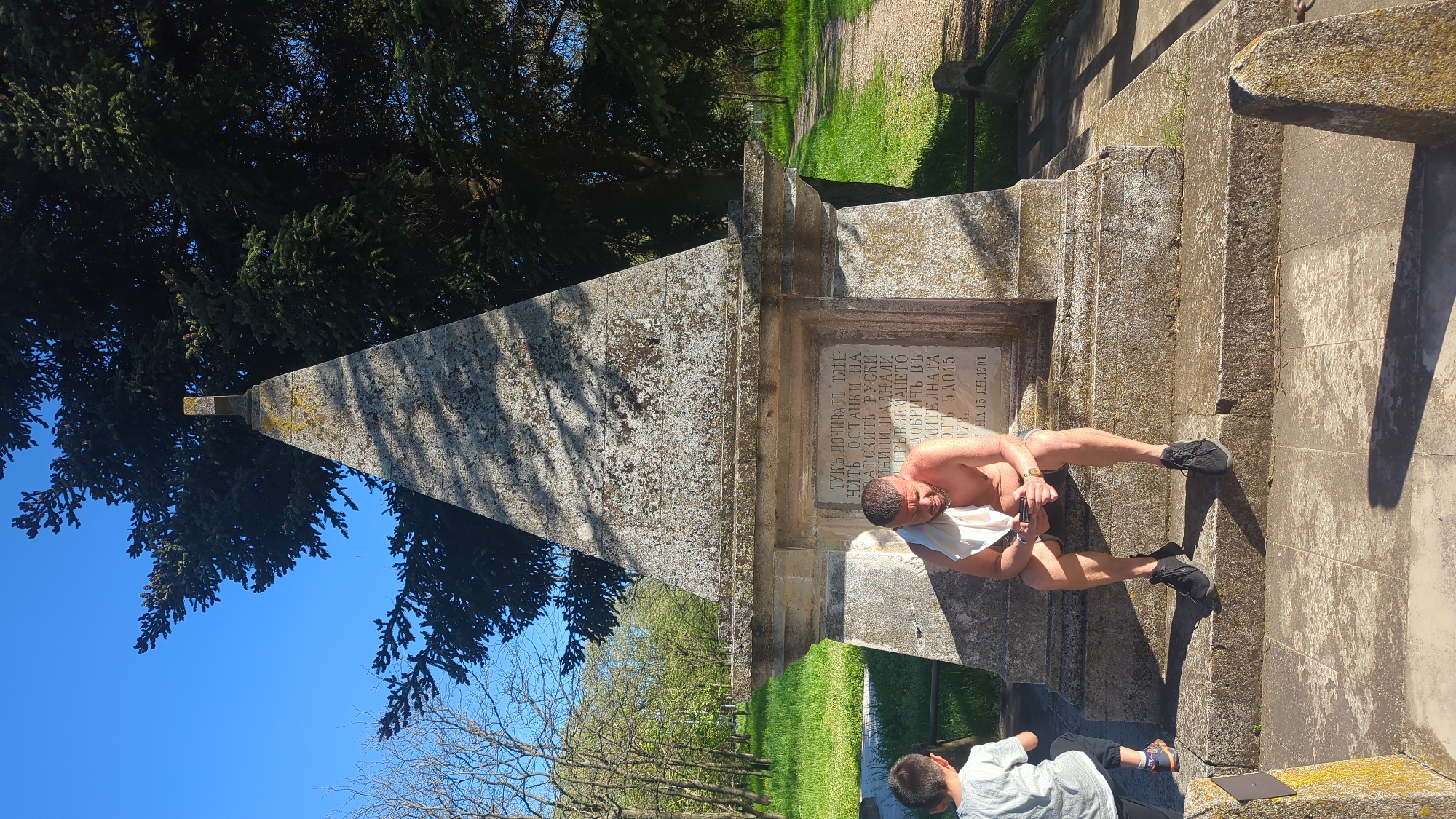stone obelisk-shaped monument in Dobrich, Bulgaria. The monument has an engraved plaque with Cyrillic text. A shirtless man is sitting on the base of the monument, looking at a mobile phone. Another person is reclining on the base, at the feet of the first man. The background includes trees, grass, and a blue sky.