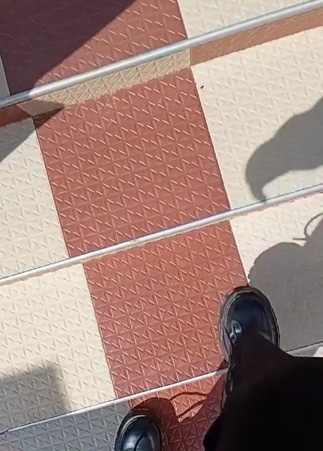 person descending a set of stairs. The stairs are tiled in a checkered pattern of cream and rust-colored tiles, with a diamond-shaped relief texture. The staircase has metal railings. The person wears black pants and black shoes. The video is shot from a first-person perspective, looking down at the stairs. The shadow of the person taking the video is visible on the stairs. The lighting suggests it is daytime.