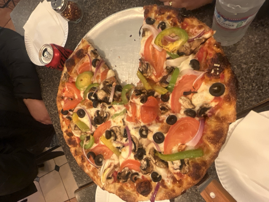A pizza rests on a round metal tray, some slices missing. It is topped with tomatoes, mushrooms, black olives, onions, and bell peppers. A can of Coca-Cola, a shaker of red pepper flakes, and a stack of white plates sit nearby. A bottle of water is also visible in the background. The pizza and drinks are placed on a dark countertop. Parts of people are visible at the left and at the top.