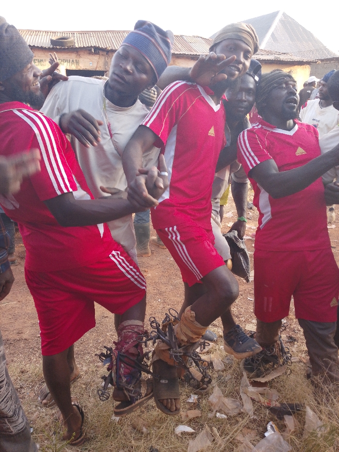 A group of men are closely gathered, some wearing red and white Adidas soccer jerseys and shorts. Their footwear varies from sandals to sneakers, some tied together with wire. One man in a white shirt and striped hat is being held, while another is making a hand gesture. The ground is littered with plastic bags and debris. A building with a sign is in the background.