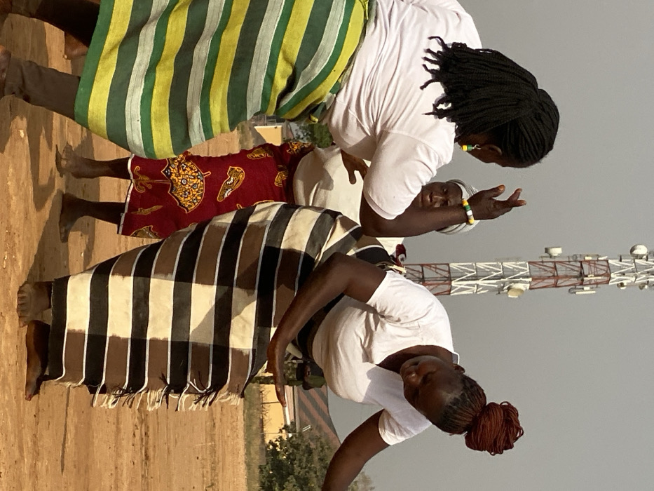 Three women stand barefoot on a dusty ground. They wear white t-shirts and traditional patterned wraps. One wrap has dark brown and light beige stripes with a fringed hem, another is red with yellow patterns, and the third features green and yellow stripes. A radio tower rises in the background. Two women have their arms bent and gesturing. The woman on top has black braided hair, while the one below has reddish-brown hair styled in a bun.