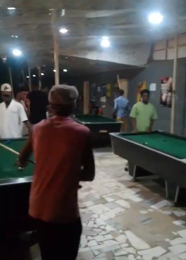 pool hall with multiple pool tables and people playing or watching. The floor has a patterned tile design, and the ceiling is low and covered with what appears to be a canvas stretched between poles. Artificial lights hang from the ceiling. Outside the structure, there's a glimpse of a fenced-off area with some people sitting. The main focus is on a man in a pink tank top and black shorts who is about to take a shot at the pool table in front of him. Another man in a white shirt and cap stands nearby, observing the game. Several other people are scattered throughout the room. The general atmosphere is casual and social.
