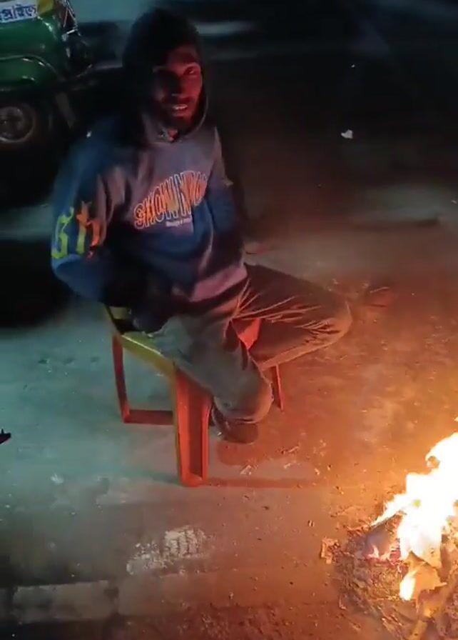 group of people gathered around a small fire on a paved surface outdoors at night. Initially, a person in a hoodie and pants sits on a plastic chair near the fire. Later, a woman in red pants and a dark coat sits in another plastic chair holding a child, positioning themselves closer to the fire. People can be seen walking in the background, their legs and feet visible. The fire is small but has bright flames. The overall scene appears to be an attempt to stay warm on a cold night.