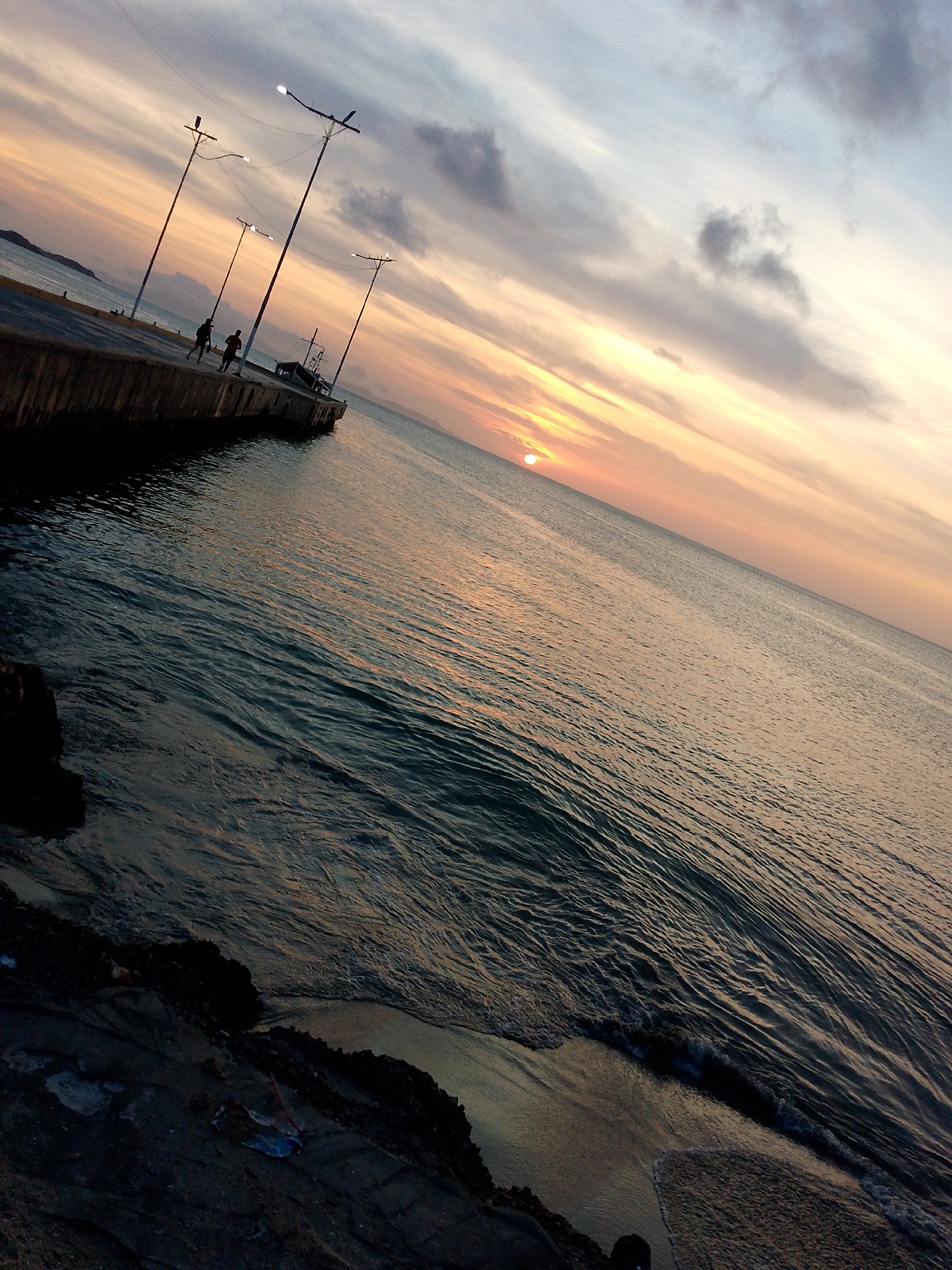 The photograph captures a coastal scene in Juan Griego, Venezuela, at sunset. The perspective is tilted, showing the ocean extending towards the horizon where the sun is setting, casting an orange glow on the water and sky. A concrete pier or walkway runs along the left side of the frame, with two people appearing as silhouettes against the sunset. Light poles are spaced along the pier, adding vertical lines to the composition. The foreground features a rocky shoreline with small waves washing onto a dark, sandy beach. Trash is visible on the rocks.