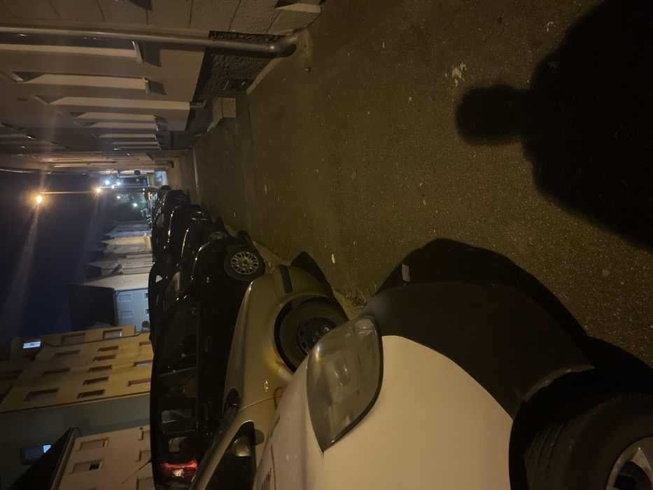 The image displays a nighttime urban street in Tuttlingen, Germany. A line of parked vehicles, primarily dark-colored, occupies the left side of the thoroughfare, receding into the background. In the foreground on the left, the front quarter of a white vehicle with a black bumper is visible, followed by a gold-colored sedan, and then multiple black compact cars. Multi-story residential-style buildings flank both sides of the street. The building on the left is light-colored with several windows, one showing internal illumination on an upper floor. The building on the right presents a dark stone-clad base, lighter upper stories, and a vertical rain gutter. A tall streetlight in the mid-ground provides the primary illumination, casting a distinct human shadow onto the foreground pavement. The paved surface is worn and displays scattered minor debris.