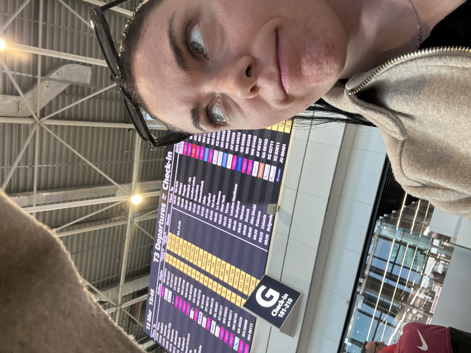 The image depicts an indoor scene within the Rome Fiumicino Airport (FCO), specifically Terminal 3, in Fiumicino, Italy, at approximately 15:46 on March 13th. The primary subject is a female individual positioned in the right foreground, with her head and upper torso visible. She has dark hair, light eyes, and is looking upwards and to her left, with a neutral to slightly pursed-lip expression. Black-framed sunglasses are perched on her head. She wears a light beige or tan textured zip-up jacket over a dark garment. In the background, a large digital departure and check-in board is prominently displayed, titled "T3 Departures Check-in." The board lists flight times, destinations such as Palermo, Mexico City, London Heathrow, and New York, alongside airline codes, flight numbers, and corresponding check-in counter ranges (e.g., 157-165, 181-190). Below the main board, a white sign with a large black "G" indicates "Check-in 181-210." The ceiling structure of the terminal is visible at the top, characterized by exposed metal trusses, beams, and integrated lighting fixtures, consistent with modern airport architecture. In the lower left background, partially obscured by glass reflections, a portion of another individual wearing a red top with a white Nike logo is discernible. The overall environment is brightly lit, indicative of a busy airport concourse or check-in area.