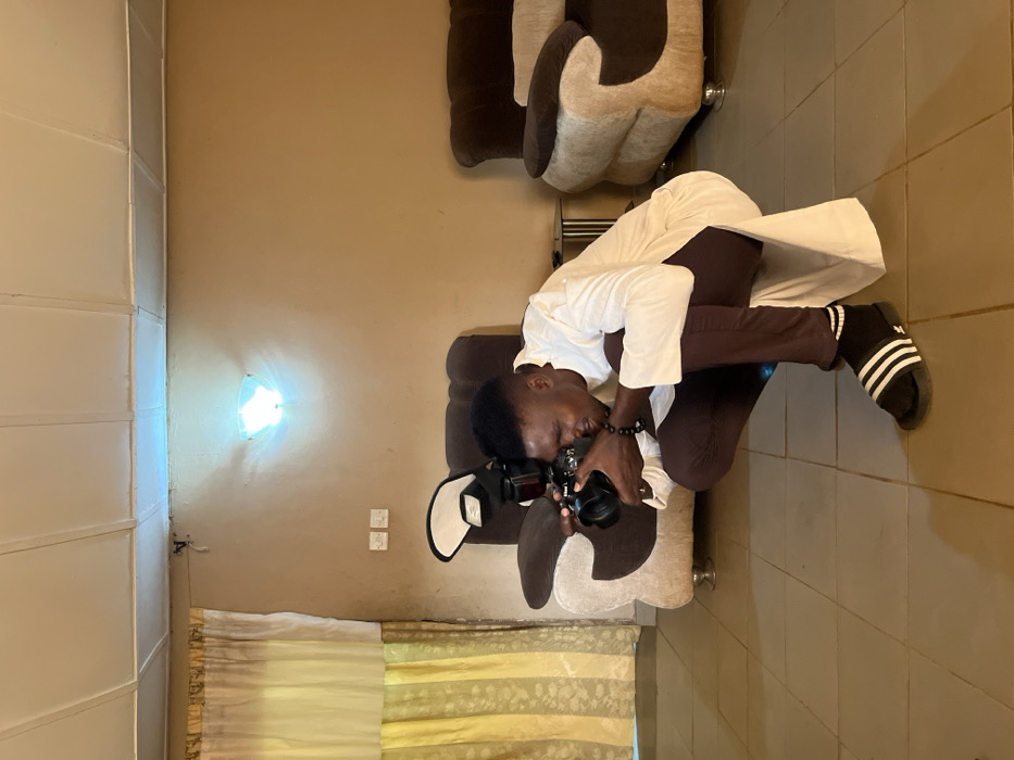 An adult male is captured in a deep crouch indoors in Kuru Dungus, Nigeria