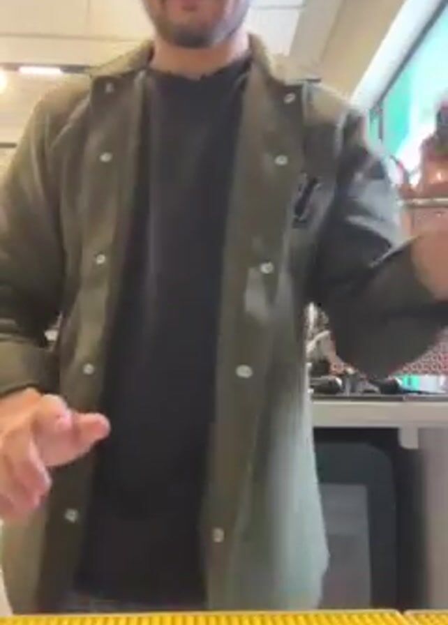 A man wearing a green overshirt and a black t-shirt pours the contents of a metal cocktail shaker into a tall, diamond-patterned glass