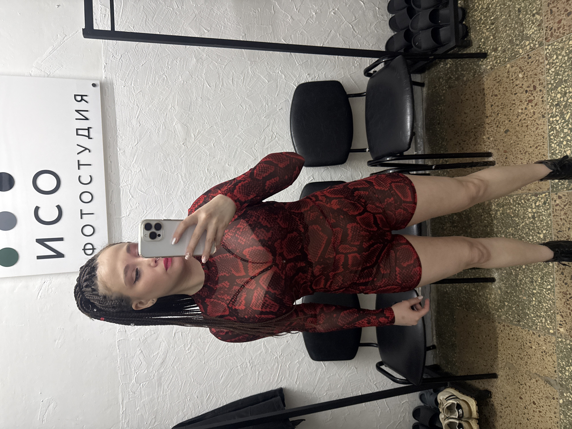 A woman is taking a selfie in a room that appears to be a photography studio in Saratov, Russia. She is wearing a red and black snakeskin print dress with long sleeves and black boots. She has her hair braided. She is holding a smartphone in her right hand, taking the picture. In the background, there is a white wall with the inscription "ИСО Фотостудия" and several chairs. The floor is tiled in a speckled beige and brown pattern. Also visible are clothing racks with black garments, and a shoe rack with shoes.