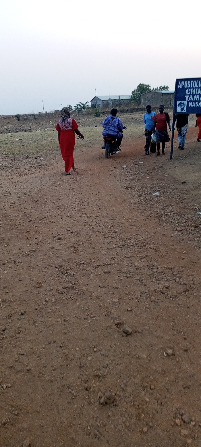 The image depicts an unpaved reddish-brown dirt road with scattered small rocks and gravel under a pale, hazy sky, likely in the city of Nassarawa, Nigeria. In the foreground, a person in a long red patterned dress and light sandals walks away from the camera, carrying a light-colored object in their right hand. Slightly further along the road, a person in a blue and white patterned shirt operates a black motorcycle, also moving away from the viewer, with another person possibly riding pillion. To the right, a blue signpost reads "APOSTOLIC CHURCH TAMA NASAR," confirming a location in Nassarawa. Next to the sign, a group of three individuals walks away from the camera: one in a light blue shirt and dark trousers, another in a reddish-brown shirt and dark skirt carrying a light-colored bucket, and a third mostly obscured individual. A fourth person in red is partially visible on the far right. In the background, sparse dry vegetation lines the road, and several distant buildings with light walls and dark roofs are visible under the horizon, alongside a utility pole on the left.