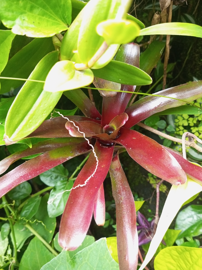 A red and green bromeliad plant sits amidst lush foliage. It has glossy leaves arranged in a rosette shape with water collected in the central cup. Tendrils, likely from a vine, curl around the plant. The surrounding plants are various shades of green, indicating a damp or humid environment.