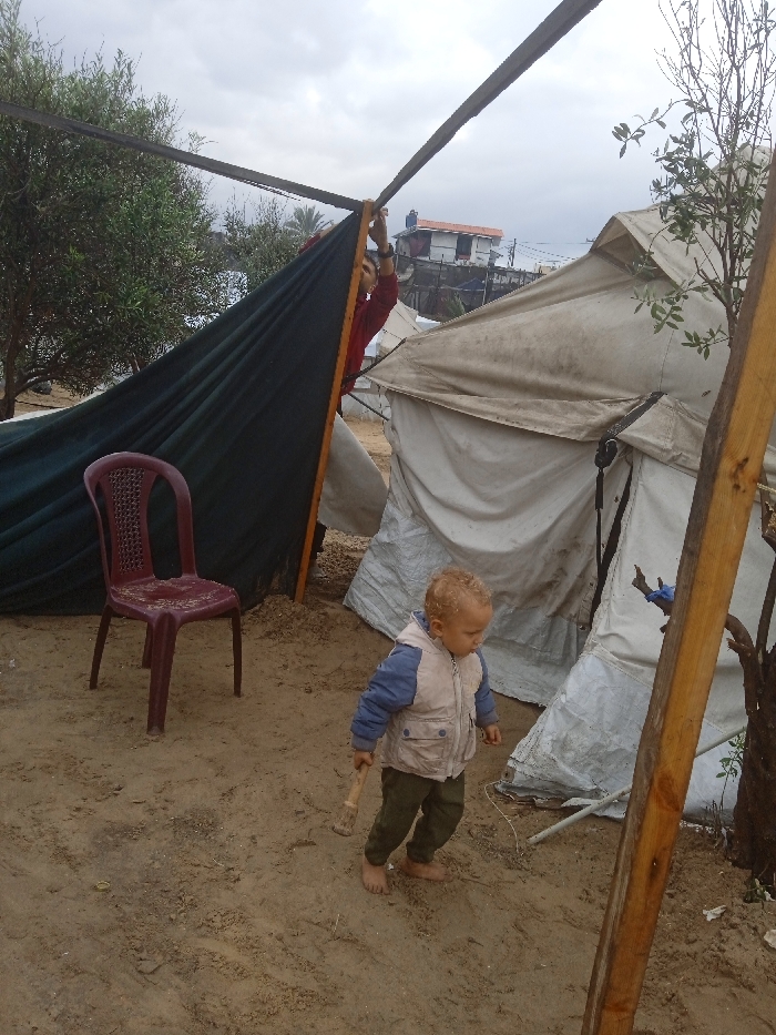 A young barefoot child in a jacket and pants stands on sandy ground holding a small wooden object. Behind him are makeshift shelters constructed of tarps and wooden beams. An adult is partially visible, working on the construction. A red plastic chair sits nearby. The scene appears to be an informal settlement, with trees and a distant building visible in the background under a cloudy sky.