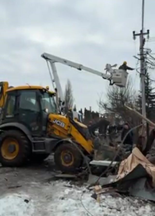 A yellow JCB backhoe loader is positioned amongst debris in a snowy area. The backhoe is equipped with an extended white boom lift carrying a person in a safety basket. The person in the basket appears to be working on electrical lines connected to a utility pole to the right of the backhoe. Another person is standing nearby amidst the debris. The sky is overcast and bare trees are visible in the background.