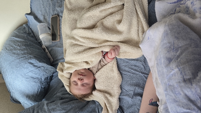 The image depicts an indoor scene on a bed, reportedly located in Burgas, Bulgaria. A Caucasian infant, with light brown hair, is observed sleeping on their back with eyes closed, situated on blue bedsheets featuring a subtle pattern. The infant is partially covered or swaddled in a beige terry cloth towel, with a light-colored long-sleeved garment visible beneath. A thin red string is tied around the infant's right wrist. Adjacent to the infant's head, a clear baby bottle with a white band, a smartphone with a light-colored case, and a white remote control are positioned on the bed. In the lower-left foreground, a bare adult arm is partially visible, displaying a tattoo of a blue cartoon character resembling Stitch from Lilo & Stitch.